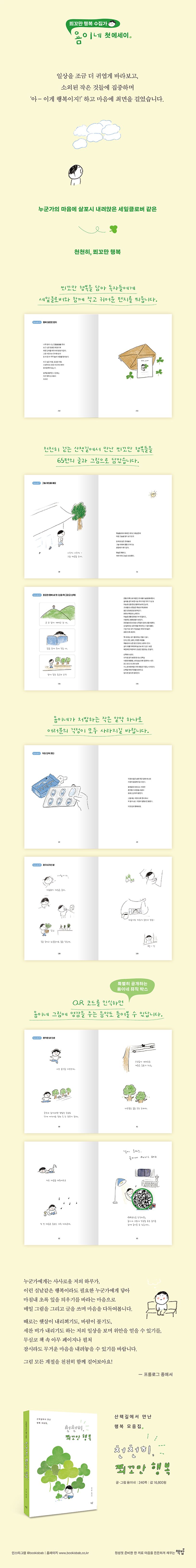 스스로 작은 행복감을 느낄 때마다 그림을 그리고 글을 써 작고 네모난 인스타그램 세상에 공개하곤 했다는 작가는 자신의 첫 에세이 〈천천히, 쬐꼬만 행복〉 속 65편의 일상 에피소드들이 누군가에게는 지친 마음에 살포시 내려앉는 세잎클로버 같은 존재로, 또 누군가에게는 친구 같은 책으로 전달되길 기대한다.