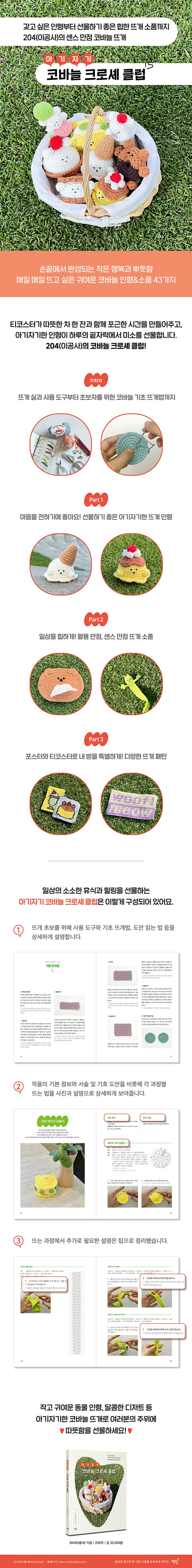 책에는 작가가 주로 사용하고 있는 도구와 실뿐만 아니라 코바늘 뜨개의 이해를 돕기 위한 기초 설명과 도안 읽는 법 등을 상세하게 담았으며, 작가의 작품에 많이 등장하는 인형 뜨개 기법을 비롯해 다양한 뜨개 활용법도 친절하게 설명하고 있습니다.