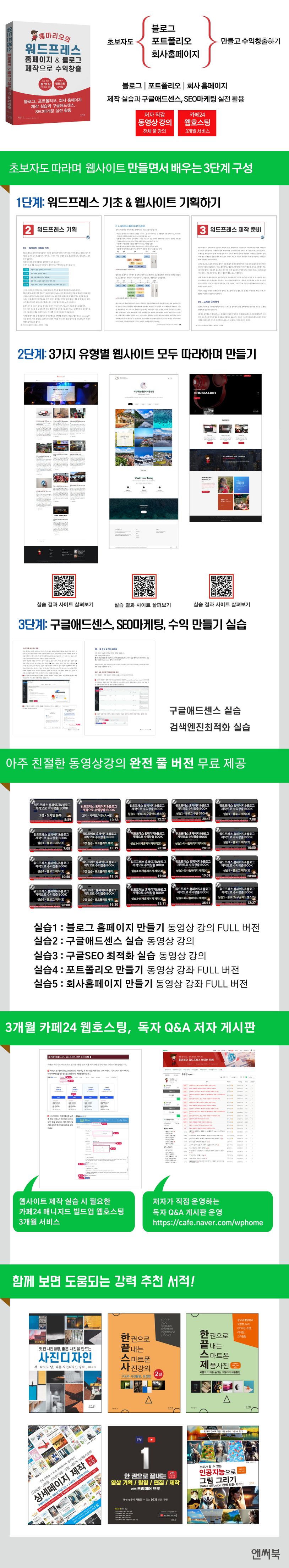 〈홍마리오의 워드프레스 홈페이지 & 블로그 제작으로 수익창출〉 책은 블로그, 포트폴리오, 회사홈페이지 3가지 유형의 웹사이트를 직접 제작해보고, 또한 웹사이트가 잘 검색되도록 SEO(검색엔진최적화) 마케팅 실습과 구글애드센스로 수익을 만들 수 있는 구체적인 과정을 따라하기 실습과 동영상 풀 강좌로 아주 친절하게 설명했다.