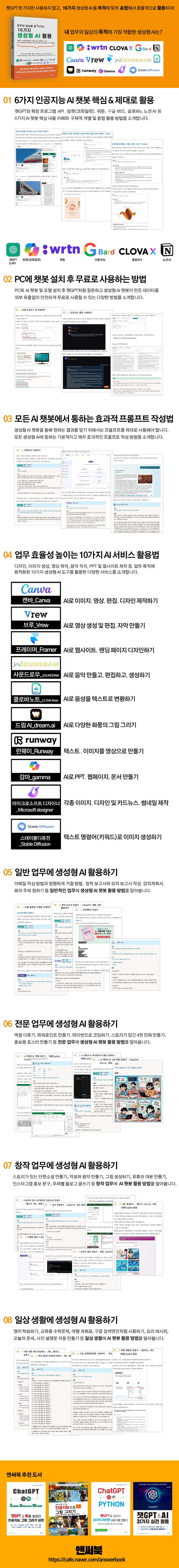 〈16가지 생성형 AI 활용〉책은 모든 생성형 AI에서 통화는 프롬프트 작성법부터 챗GPT, 빙챗(코파일럿), 뤼튼, 바드, 클로바x, 노션 등 6가지 생성형 AI 챗봇과 10가지 생성형 AI 인공지능 도구를 혼합 활용하는 방법까지 모두 담았습니다.
