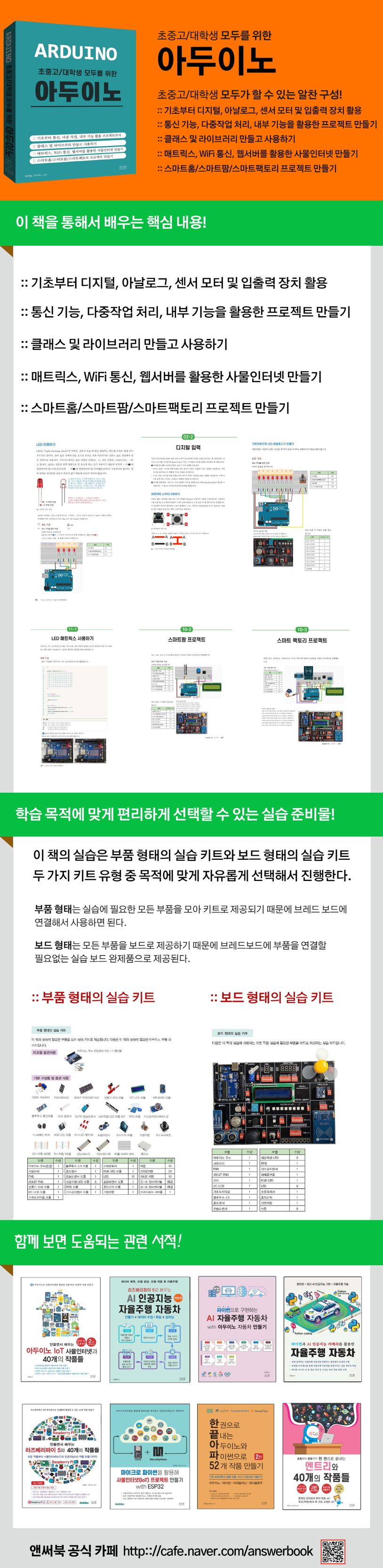 〈초중고/대학생 모두를 위한 아두이노〉 책은 기초부터 통신, 다중 작업, 내부 기능 활용 프로젝트, 사물인터넷, 스마트홈/스마트팜/스마트팩토리 프로젝트까지 초중고, 대학생 모두가 배울 수 있도록 구성하였다.