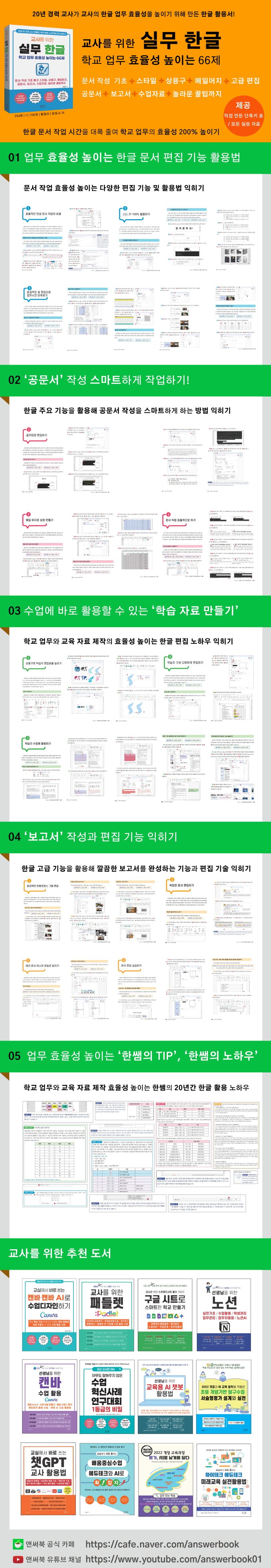 이 책은 문서 작성의 기초 한글 핵심 기능을 실습으로 빠르게 떼고, 스타일, 상용구, 메일머지, 공문서, 보고서, 수업자료 이외 업무에 꼭 필요한 66가지 주제별 따라하기 방식의 실습을 통해 유치원, 초·중·고 선생님의 한글 업무 활용 능력이 확 올릴 수 있는 교사 맞춤형 한글 필독서이다.