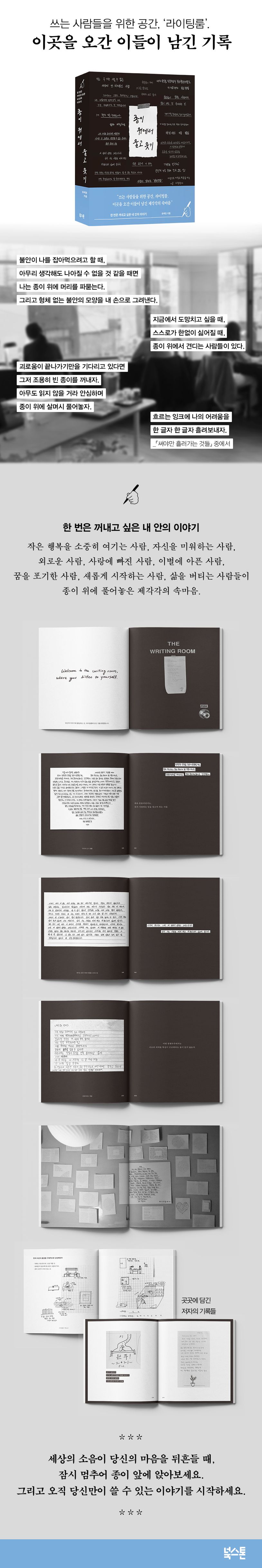 이 책에는 라이팅룸을 오간 수많은 이들의 기록물이 실려 있다. 자신을 미워하는 사람, 작은 행복을 소중히 여기는 사람, 외로운 사람, 사랑에 빠진 사람, 이별에 아픈 사람, 꿈을 포기한 사람, 삶을 버티는 사람들이 품은 제각각의 속마음을 볼 수 있다. 같은 시간을 살아가는 다른 사람들의 흔적을 마주하고 나면, 내 안에 간직해온 이야기 한 조각도 내어놓고 싶단 용기가 생긴다. 단 한 번이라도 좋으니 오직 나만이 쓸 수 있는 이야기로 빈 종이를 채워보자.