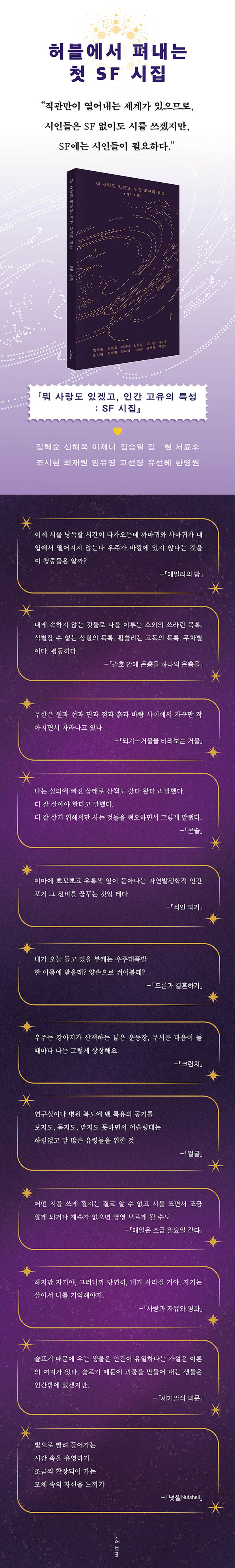 허블에서 『뭐 사랑도 있겠고, 인간 고유의 특성: SF 시집』이 출간되었다. 이 책은 SF 소설을 주로 출간해 온 허블에서 드디어 펴낸 첫 시집이며, 무엇보다 ‘SF 시집’이라는 이름이 직접 붙은 국내 첫 시집이기도 하다. 김혜순, 신해욱, 이제니, 김승일, 김현, 서윤후, 조시현, 최재원, 임유영, 고선경, 유선혜, 한영원. 별다른 수식이 필요 없을 정도로 저마다 고유한 영토를 구축해 온 시인들이 시적인 것의 특장과 SF성의 접점을 모색한 결과물이 이 한 권에 모였다.
