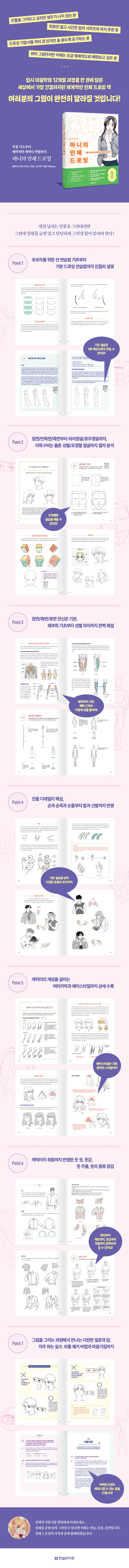 8만 그림 유튜버이자 13년째 입시 미술학원에서 강의해온 마니의 캐릭터 작법 노하우를 한 권에 담았다. 인물을 그려보고 싶지만 엄두가 나지 않는 분, 학원은 멀고 시간은 없어 시작조차 하지 못하는 분, 드로잉 기법서를 여러 권 샀지만 늘 중도에 포기하는 분, 취미 그림러지만 제대로 인물을 그려보고 싶은 분들의 고민을 단번에 날려줄 기법서이다. 얼굴은 기본이고 전신부터 핵심 해부학까지 완벽한 인체 기본기를 익힐 수 있도록 돕는다. 이목구비와 표정, 헤어와 옷 주름까지 다루므로 폭넓은 캐릭터 작화력을 배울 수 있다. 중간중간 드로잉 허들 제거 비법을 담아 지치지 않고 더 쉽고 재미있게 그림을 그려나갈 수 있도록 돕는다.
