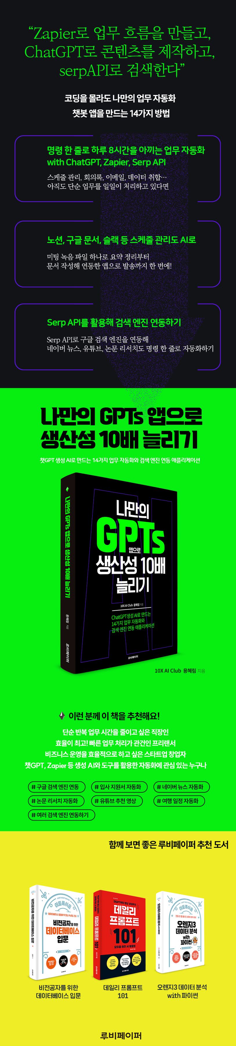 이 책에서는 업무 자동화 파이프라인 도구 Zapier를 GPTs와 연동하여 이메일, 문서, 달력, 메신저 작업을 하나의 업무 흐름으로 만드는 방법을 실습해본다. 이 모든 작업을 코딩 없이 자연어 프롬프트만으로도 인공지능 챗봇을 만들 수 있다. 직장인이라면 누구나 할 만한 작업을 대상으로 실습 과정을 거치다 보면 생성 AI 모델의 원리를 이해하고 직접 GPTs 앱을 만들 수 있게 된다.