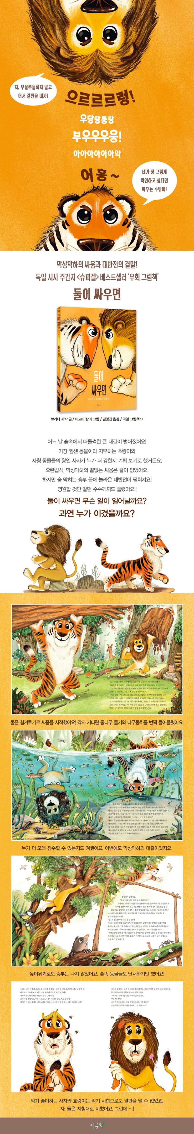 떡잎그림책17. 어느 날 숲속에서 큰 싸움이 벌어졌어요! 자칭 가장 힘센 동물 호랑이와 자칭 동물의 왕인 사자가 누가 더 강한지 가려 보기로 했거든요. 둘은 온 힘을 다해 싸웠어요. 그러나 아무리 숨 막히는 대결로 거듭거듭 싸워도 결과는 막상막하였지요. 지켜보던 숲속 동물들도 난처하기만 했어요. 하지만 둘은 싸울수록 지치고 힘들어져도 어떻게든 승부를 내고 싶었어요. 그러다 놀라운 일이 벌어졌어요. 영원히 알 수 없는 수수께끼 같던 대결이 단박에 승부가 난 거예요! 아무도 예상치 못한 대반전이었지만, 숲속 동물들은 모두 고개를 끄덕였답니다!