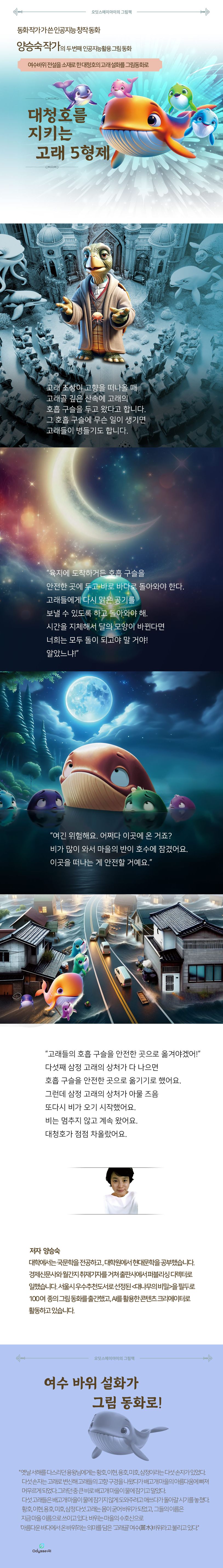 며칠째 병든 대왕고래가 늘고 있어요. 용궁은 난리가 났어요. 문어대신은 빨리 대책을 세우지 않으면 바다에서 고래들이 모두 사라질지도 모른다고 해요. 용왕님은 고민이 많았어요. 이유를 알지 못했거든요. 그때 거북대신이 말했어요. 모두 고래들의 고향에 있는 호흡구슬의 안전에 문제가 생겼을지도 모른다고요. 1000년전에도 그랬데요. 고래들이 고향에 있는 호흡구슬을 구하기 위해 용왕님의 다섯 손자 황호, 이현, 용호 미호, 삼정이 나섰어요. 용왕님은 손자를 모두 고래로 변신시켜주었어요. 대한민국의 앞바다에서 고래들의 고향 대청호를 향하는 5고래. 그곳에서 다섯 고래에게는 무슨 일이 있었던 것일까요? 대청호주변 마을 이름 황호, 이현, 용호 미호, 삼정과 고래로 변신한 용왕님의 다섯 손자 이름이 같은 것은 우연일까요?