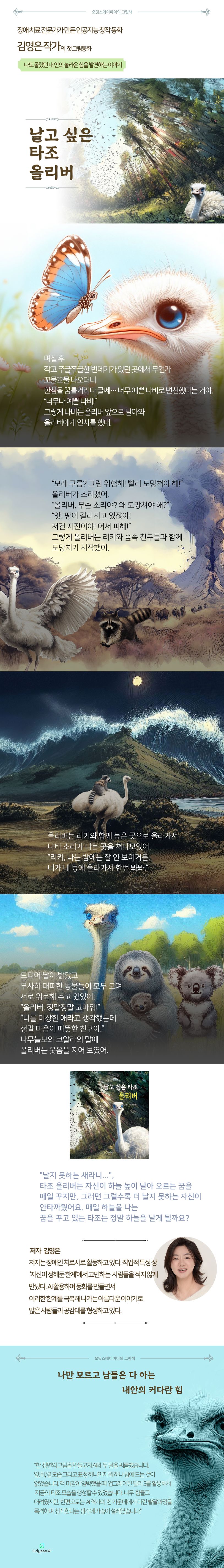 모두가 즐거운 동물 친구들 사이에서 타조 올리버는 즐겁지가 않았어요. 새라고는 하지만 하늘을 날 수 없는 새. 친구들은 모두 올리버를 놀렸어요. 언젠가 하늘을 날겠다고 다짐하는 올리버. 어느 날 꿈틀거리는 애벌래에서 날아다니는 나비로 변하는 것을 본 순간, 올리버는 나비에게서 날 수 있는 해답을 찾을 수 있을 거라고 생각해 나비를 따라갑니다. 정신없이 나비를 따라가다 보니 그곳은 새들의 세상이 아닌 동물의 세상이었죠. 그곳에서 올리버에게 새로운 인생이 펼쳐집니다. 올리버, 올리버! 멋있는 올리버! 여기 좀 도와줘. 올리버! 올리버! 여기도 도와줘! 도대체 올리버에게 무슨 일이 생긴 걸까요?