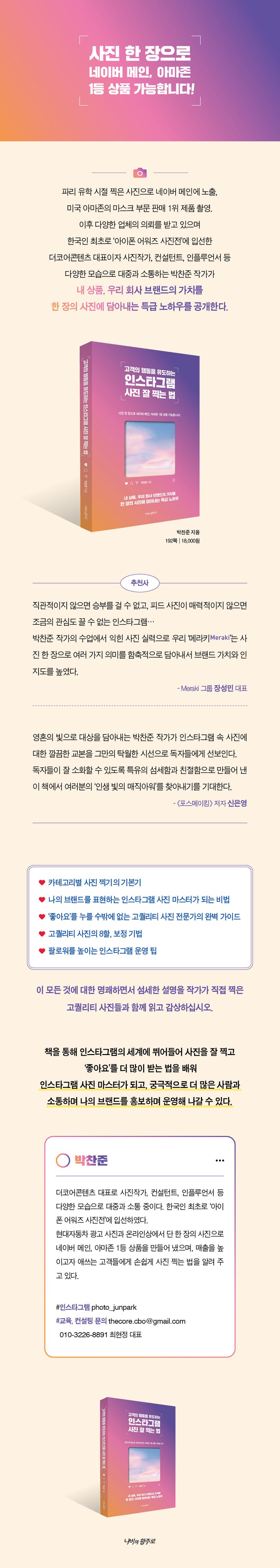 전 세계 5억 명 이상이 날마다 사용하고 하루 수백만 장 이상의 사진 및 동영상이 업로드되는 인스타그램은 현대의 브랜드 마케팅에서 빼놓을 수 없는 제3세대 SNS 공간이다. 이 인스타그램에서 가장 중요한 요소인 사진에 내 상품, 우리 회사 브랜드의 가치를 담아내는 특급 노하우를 사진 전문가 박찬준이 아낌없이 전한다.