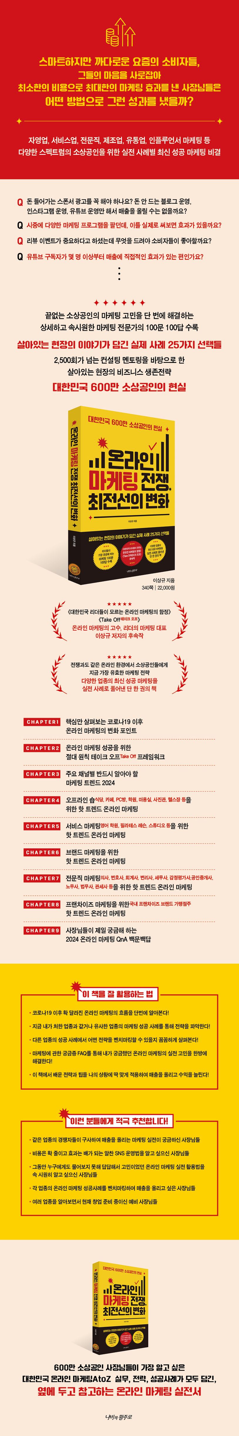 사실 온라인 마케팅의 비중 확대는 이전부터 쭉 이어져 온 하나의 트렌드였다. 원래대로라면 천천히, 완만히 디지털 전환이 이루어졌을 텐데, 코로나19가 일종의 도화선이 되어서 급속도로 폭발한 느낌이다. 이제는 마케팅을 논할 때 코로나19 이전과 이후를 동일시할 수 없게 되었다. 지금의 온라인 마케팅 트렌드를 정리하자면 ‘채널의 고착화와 광고 피로도 증가, 모든 제품의 상향 평준화, 유통의 한계, D2C 마케팅, 브랜드 마케팅의 대두’를 들 수 있다. 그렇다면 이렇게 달라진 환경에서 지금 가장 유효한 마케팅 전략은 무엇일까? 600만 소상공인 사장님들은 어떤 전략을 구사해야 치열한 마케팅 전쟁에서 살아남고 매출을 올리고 승승장구할 수 있을까? 바로 이에 대한 명쾌한 해답, 해결책, 결론이 바로 이 책《온라인 마케팅 전쟁, 최전선의 변화》에 담겨 있다.