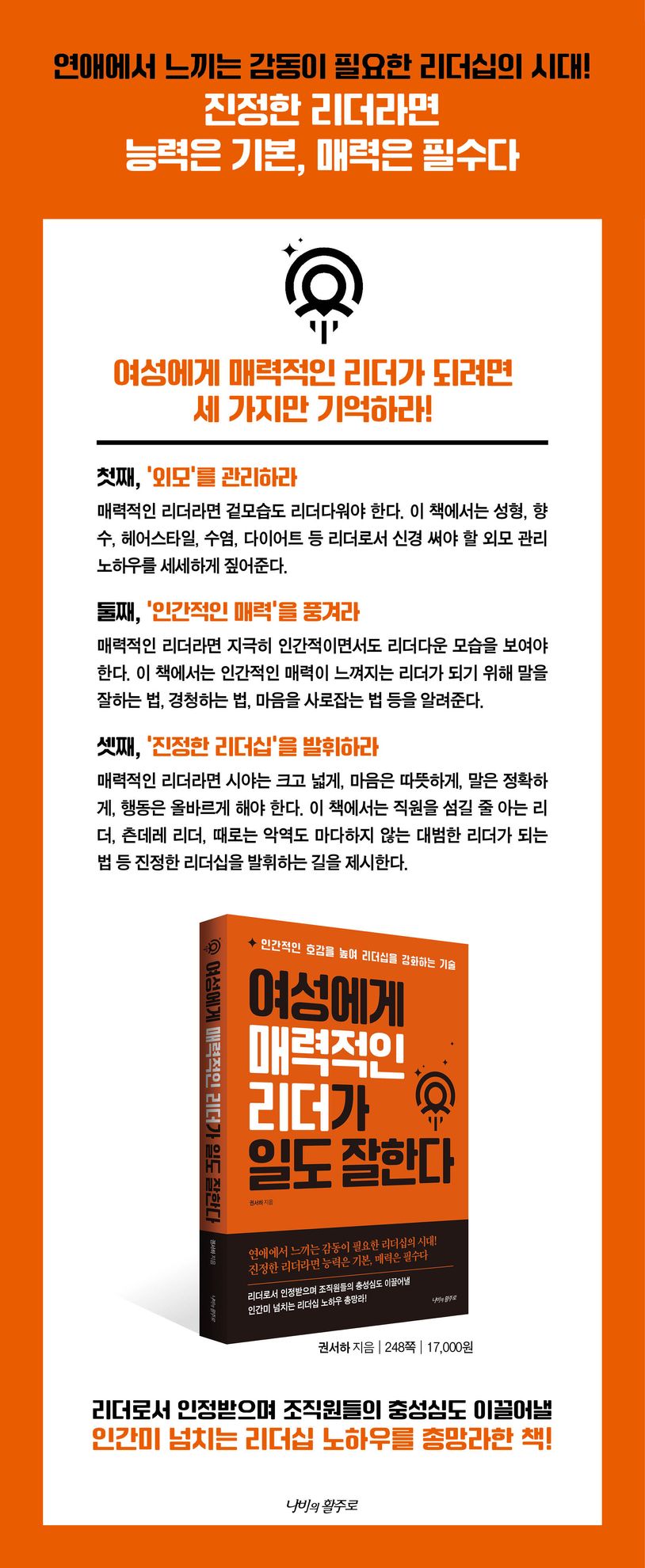 이제 연애에서 느끼는 감동이 필요한 리더십의 시대다. 진정한 리더라면 능력은 기본, 매력은 필수라는 사실을 일깨워주는 이 책은 외모, 인간적인 매력, 진정한 리더십을 갖춤으로써 인간적인 호감을 높여 리더십을 강화하는 기술을 알려준다. 이 책에 나오는 내용을 실천하면 여성 직원에게 호감을 얻는 것뿐만 아니라 남성 직원에게도 인기가 높아지는 놀라운 결과가 나타날 것이다. 또한 조직이나 회사의 잘못된 기업문화를 바꾸고 남성과 여성의 심리 분석과 그것을 꿰뚫을 수 있는 통찰력으로 남성과 여성 직원의 갈등을 풀어갈 수 있는 기반을 마련할 수 있을 것이다. 리더로서 인정받으며 조직원들의 충성심도 이끌어낼 인간미 넘치는 리더십 노하우를 총망라하는 이 책은 결국 여성과 남성 모두에게 매력적으로 다가가는 리더로 거듭날 수 있는 발판이 되어줄 것이다.
