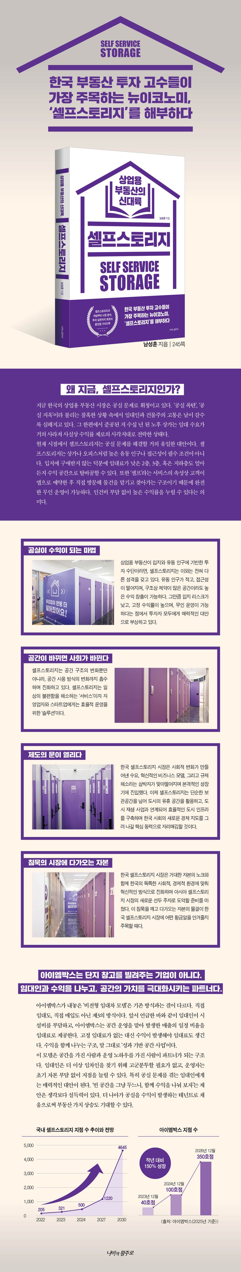 지금한국의상업용부동산시장은공실문제로휘청이고있다.‘공실폭탄’,‘공실지옥’이라불리는참혹한상황속에서임대인과건물주의고통은날이갈수록심해지고있다.그한편에서준공된지수십년된노후상가는임대수요가거의사라져사실상수익률제로의사각지대로전락한상태다.불행하게도공실문제의앞날은그다지낙관적이지않다.상업용부동산시장이공급과잉상태인데도서울을비롯한수도권은물론이고지방중소도시에서는여전히지식산업센터와대규모상가건물이올라가고있다.상가를보유한개인투자자,자산운용사,시행사모두‘이공간을어떻게써야할지’에대한해답을찾지못하는상황이다.이복잡한문제들을하나로연결하면결국떠오르는키워드가하나있다.바로셀프스토리지다.주거공간은좁아지고,공실은늘어나며,현대인의라이프스타일은점점더많은물건과유연한공간을요구한다.셀프스토리지는‘창고’라고부르기에부족할만큼다층적인역할을하고있다.단지창고산업의진화가아니라도시가살아남는하나의방법이됐다.투자자에게는유망한수익형부동산투자처로서,임대인에게는안정적인수익원으로서,사용자에게는공간스트레스를줄이는일상의인프라로서작동한다.셀프스토리지는도시구조의압력을완충하는완전히새로운해결방식이다.나아가셀프스토리지는도시재생의훌륭한처방전이기도하다.오랫동안비워진상가,쓸모를잃은지하공간,찾는사람이없는노후건물은도시에짙은그늘을드리운다.이들이다시쓰이기시작할때비로소도시는활기를되찾을수있다.그런의미에서셀프스토리지는낡은자산을다시작동하게만드는최소단위의도시재생수단이될수있다.도로를뜯고마스터플랜을짜는대규모개발이아니라작고빠르게,하지만확실하게도시의쓰임을회복하는도구가될수있다.미국,유럽뿐아니라일본,싱가포르와같은아시아국가에서는이미편의점과같은생활밀착형시설로자리잡았다.미국전역에서영업중인셀프스토리지시설수는5만2,000여개로추정되며스타벅스,맥도날드,던킨등미국5대식음료프랜차이즈시설을합한수와거의같다.가까운일본도셀프스토리지시설수가패밀리레스토랑시설수를앞지른지오래며,이제는편의점을위협하는수준으로성장하고있다.이들나라에비하면한국셀프스토리지시장은아직걸음마단계다.도시화와고령화,1인가구증가등비슷한상황에놓인일본보다한국은1인당주거면적이더좁다.그런데도셀프스토리지시장규모는일본의9분의1에불과하다.다른시각에서보면그만큼한국셀프스토리지시장의잠재력이풍부하다고할수있다.이책은셀프스토리지를공간과자산,기술과문화가교차하는지점에서새롭게해석한다.단지짐을맡기는공간이아니라쓸모를재구성하고삶의여백을만드는시스템이자,미래의유망한비즈니스모델이자부동산투자처인셀프스토리지라는신대륙으로독자들을이끌어줄것이다.