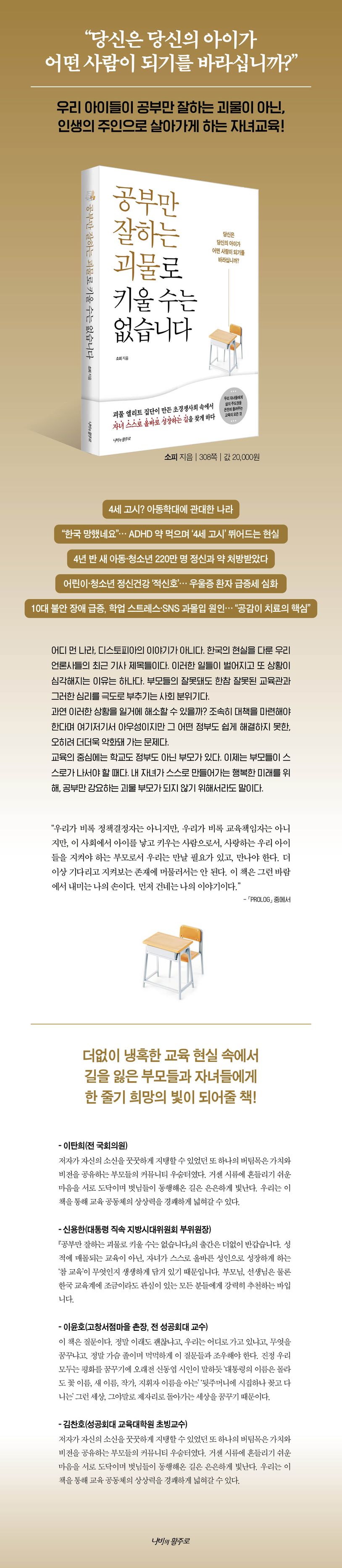 책 『공부만 잘하는 괴물로 키울 수는 없습니다』는 성적에 매몰되는 교육이 아닌, 자녀가 스스로 올바른 성인으로 성장하게 하는 ‘참 교육’에 대해 말하는 책이다. 자녀 교육 때문에 괴물이 되어 가는 자신의 모습을 깨달은 후, 자녀들은 물론 자기 자신을 위해 완전히 다른 교육법을 찾아내기 위해 고군분투했던 작가의 경험담이 생생하게 담겨 있다.