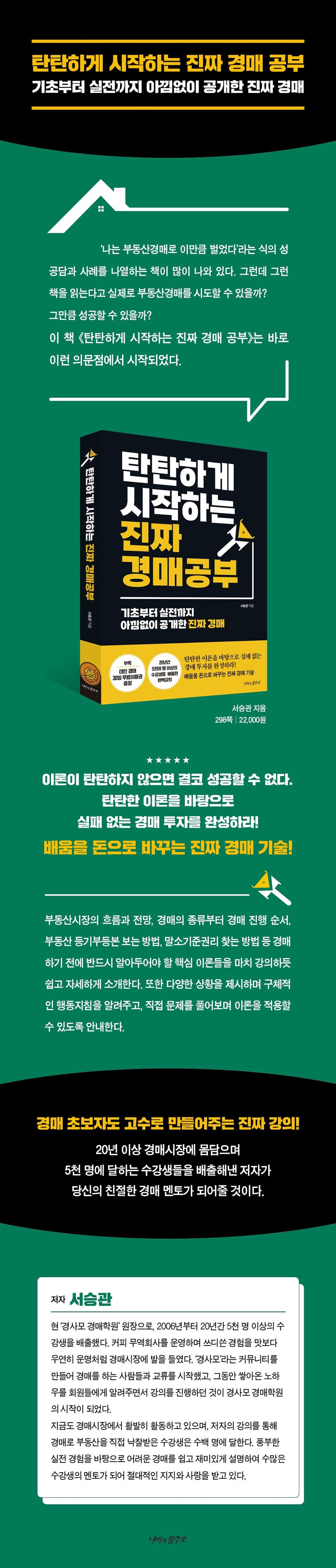 경매투자를 위한 이론과 실전 경험에서 나온 지식, 실제로 써먹을 수 있는 연습문제까지 다루는 경매의 시작과 끝인 이 책은 하나하나 빠트릴 수 없이 중요하고 유용한 내용으로 가득하다.