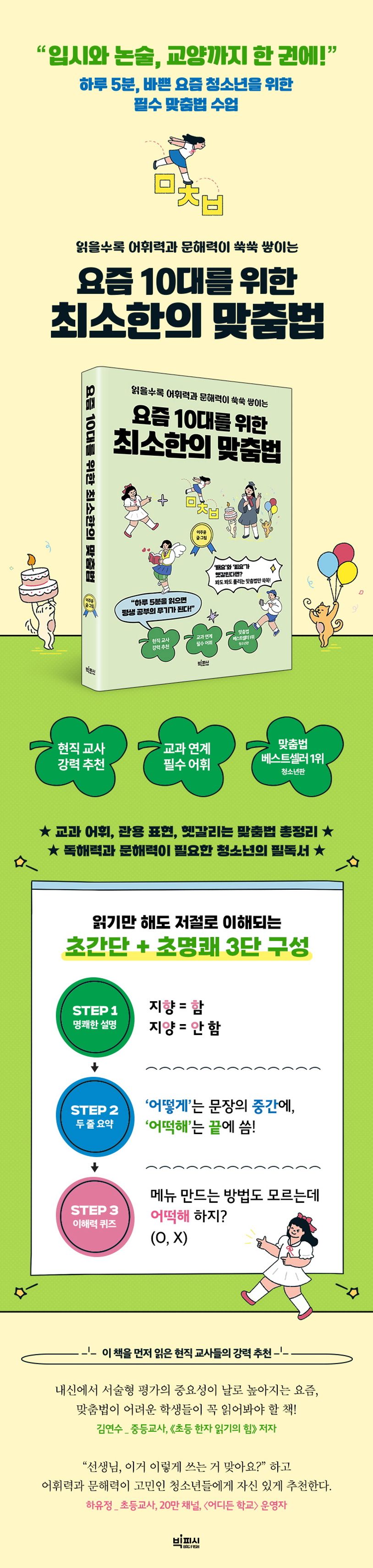 내신에서 서술형 평가의 비중과 중요성이 날로 높아지고 있다. 그뿐일까. 논술과 같은 장문의 글부터 SNS상의 짧은 메시지 한 줄까지, 자신의 생각을 제대로 표현하고 전하기 위해서도 ‘맞춤법’은 요즘 10대가 반드시 알아야 할 ‘필수 교양’이다.