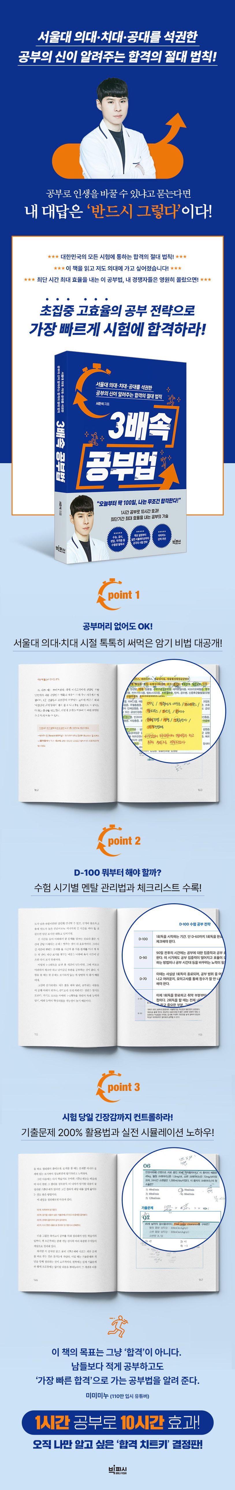 “단 한 페이지를 봐도 남들보다 빠르게 3배속으로 머릿속에 넣는다! 공부는 절대 엉덩이 싸움이 아니다!” 서울대 공대를 입학한 뒤, 서울대 의대와 서울대 치전원에 연이어 합격한 저자의 말이다. 놀랍게도 저자는 직장과 수험 생활을 병행하는 극한의 공부 환경에서도 모든 시험을 단 한 번에 합격했다. 《3배속 공부법》에서는 저자가 수능을 비롯해 의사·치과의사 국가고시 등 14년 동안 무수하게 치른 시험을 통해 단련한 최단기·고효율 합격 공부법을 빠짐없이 만나볼 수 있다. 단기간에 몰입해서 최고의 효율을 낼 수 있는 공부 습관부터 시험장에서 실력을 200% 발휘할 수 있는 실전 시뮬레이션까지! 대입 수험생부터 국가고시, 편입, 각종 자격증 시험을 준비하는 수험생이라면 누구나 궁금했을 수험 생활의 노하우가 빼곡하다.