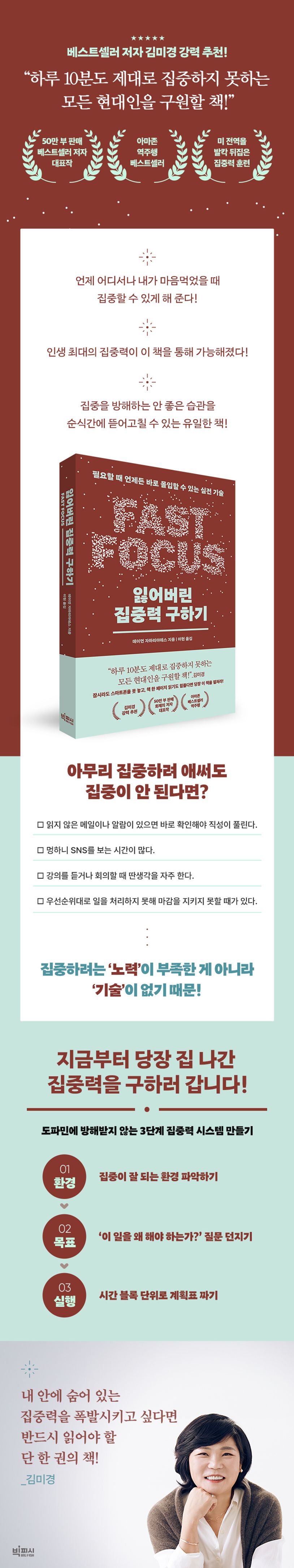 이 책에서는 집중하려고 애쓰지 않아도 저절로 집중할 수 있는 시스템을 구축하는 것이 핵심이라고 말한다. 책에서 소개된 ‘집중력 시스템’을 만드는 법을 하나씩 실천하면, 내 안에 감춰져 있던 놀라운 집중력을 발휘하는 기적 같은 몰입의 순간을 만나게 될 것을 확신한다.