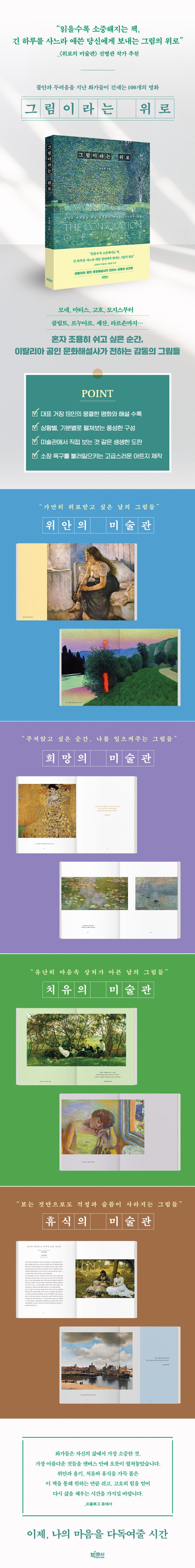 이 책에는 어떤 페이지를 무심코 펼쳐도, 오래 눈길이 머무는 그림들로 가득 차 있다. 위안이 필요할 때, 용기와 치유가 간절할 때, 혼자 조용히 휴식을 취하고 싶을 때 이 책을 펼쳐보기를 권한다. 이 책 속에서만큼은 원하는 만큼 쉬고, 영혼을 치유하는 그림이라는 위로를 마음껏 누려도 괜찮다. 이제 지친 마음을 뒤로 하고, 나를 다독일 시간이다.