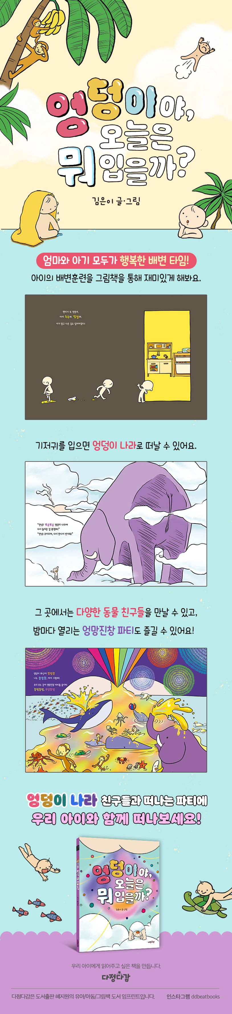 “엉덩이야, 오늘은 뭐 입을까?” 이 그림책은 아이들의 성장 관문 중 하나인 배변 훈련의 과정을 상상력을 더해서 재미있게 표현해 보았습니다. 이 책을 통해 우리 아이들이 기저귀를 떼서 팬티를 입게 되는 과정을 훈련이 아닌 재미있는 놀이처럼 받아들이길 바라봅니다.