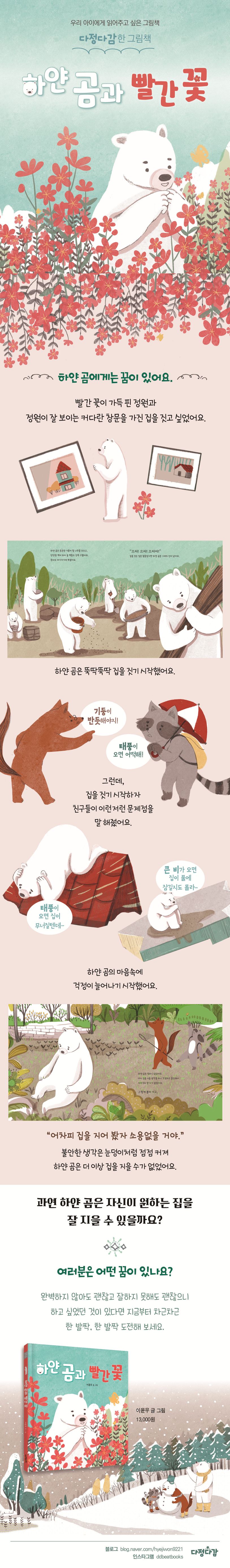 하지만 마당에 심어 둔 씨앗은 하루하루 조금씩 자라나고 있었어요. 조금씩 조금씩 꾸준히 자라 빨간 꽃을 피웠죠. 어느 날 문득, 하얀 곰은 빨간 꽃이 가득한 꽃밭을 발견했어요. 꿋꿋하게 꽃을 피워낸 빨간 꽃을 보고 용기를 얻어 하얀 곰은 다시 집을 짓기 시작했답니다. 멋진 집을 짓고 나서 친구들을 초대해 즐거운 시간도 보냈어요.