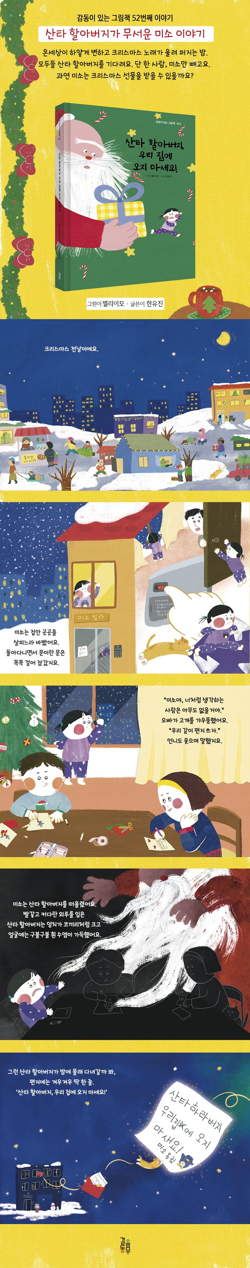 하얀 눈이 소복이 쌓인 크리스마스 전날입니다. 모두 산타할아버지를 기다리고 있어요. 단 한 사람만 빼고요. 미소는 언니, 오빠와는 달리 산타할아버지가 무섭습니다. 커다란 몸집에 새빨간 옷, 덥수룩한 수염에 무서운 목소리는 생각만 해도 깜짝 놀랄 정도지요. 겁이 난 미소는 산타할아버지에게 편지를 씁니다. “우리 집에 오지 마세요!” 미소의 편지를 받은 산타할아버지는 미소의 마음을 이해하고 멋진 답장을 보내줍니다. 그날 밤, 미소는 살짝 창문을 열고 다시 쓴 편지를 살포시 둡니다. 산타는 과연 어떤 편지를 보냈을까요? 미소는 이제 산타할아버지가 무섭지 않을까요? 우리도 미소와 함께 산타할아버지를 기다려 보아요!