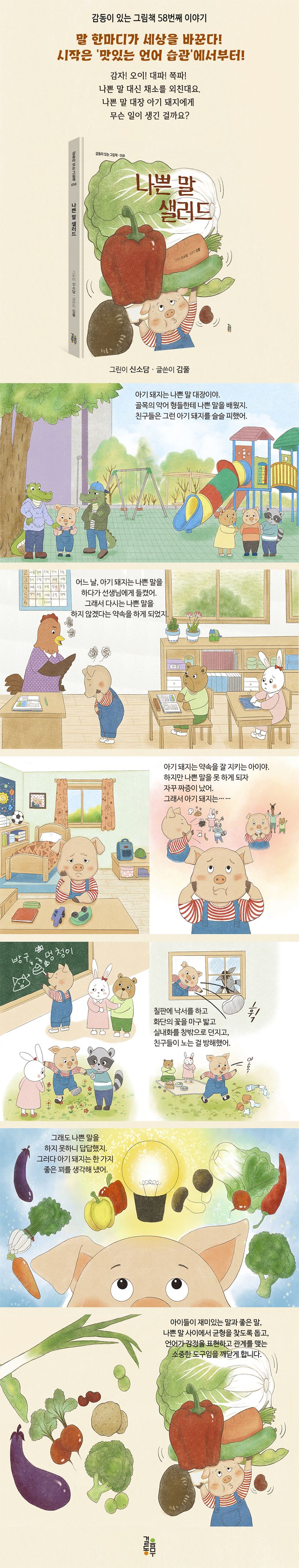 아기 돼지는 동네에서 나쁜 형들에게 나쁜 말을 배웁니다. 이상하게도 나쁜 말은 짜릿하고 재미있어서 자꾸만 입에서 튀어나오지요. 친구들에게 나쁜 말을 하던 아기 돼지는 선생님에게 들키고, 결국 혼이 납니다. 나쁜 말을 쓰지 말라는 말을 들은 아기 돼지는 너무 답답합니다. 나쁜 말을 쓸 수 없으니 화까지 나지요. 그러다 아기 돼지는 몰래 혼자만의 나쁜 말을 만들어냅니다. 비밀 무기는 바로… 채소! “선생님, 급식이 너무 감자가암자해요!” ”혼자만 먹다니, 이 가지 같은 형!“ 나쁜 말인지 아무도 모르니까 얼마나 재미있는지! 그러다 아기 돼지의 생일날이 되고, 친구들은 양손 가득 채소 선물을 가지고 들어옵니다. 양배추, 가지, 무, 브로콜리까지…. 그 채소들로 차린 생일상은 더 이상 즐겁지 않았습니다. ‘나쁜 말 생일상’ 같았던 그 순간, 아기 돼지는 깨닫습니다. 좋은 말도, 재미있는 말도, 누군가를 아프게 하면 안 된다는 것을요. 아기 돼지는 결심합니다. “이제 채소로도 나쁜 말 하지 않을 거야!”