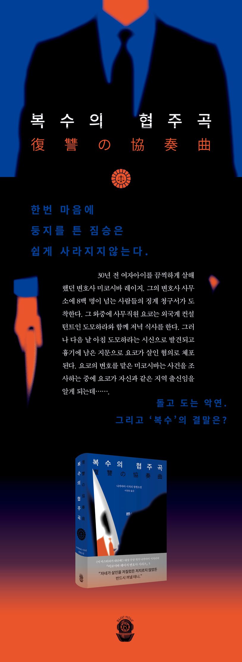반전의 제왕! 이야기의 달인! 제8회 〈이 미스터리가 대단해!〉 대상 수상 작가인 나카야마 시치리의 장편소설 『복수의 협주곡』이 블루홀식스에서 출간되었다. 시리즈의 네 번째 이야기인 『악덕의 윤무곡』 이후 4년 만이다. 블루홀식스는 창립 이래 매년 미스터리, 추리소설 출판 종수가 압도적 1위인 출판사이다. ‘나가우라 교’, ‘미키 아키코’, ‘아사쿠라 아키나리’, ‘유키 하루오’, ‘저우둥’, ‘하야사카 야부사카’, ‘후루타 덴’ 등 국내 미출간 작가들의 작품들과 국내에서 아직 인지도가 없었던 ‘오승호’(고 가쓰히로), ‘우사미 마코토’ 작가의 작품들을 블루홀식스의 사명(使命)으로 알고 출간해 왔다. 특히 ‘나카야마 시치리’의 작품들을 시리즈별로 꾸준히 출간하여 나카야마 시치리는 현재 국내에서는 일본을 대표하는 인기 작가가 되었다. 이 또한 블루홀식스 출판사만의 성과이자 지향점이라고 할 수 있다.