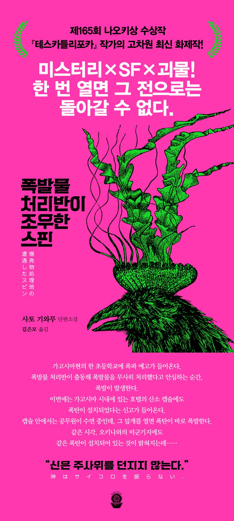 2021년 『테스카틀리포카』로 제165회 나오키상을 수상한 사토 기와무의 장편소설 『폭발물 처리반이 조우한 스핀』이 블루홀식스에서 출간되었다. 블루홀식스는 창립 이래 매년 미스터리, 추리소설 출판 종수가 압도적 1위인 출판사이다. ‘나가우라 교’, ‘미키 아키코’, ‘아사쿠라 아키나리’, ‘저우둥’, ‘하야사카 야부사카’, ‘후루타 덴’ 등 국내 미출간 작가들의 작품들과 국내에서 아직 인지도가 없었던 ‘오승호’(고 가쓰히로), ‘우사미 마코토’ 작가의 작품들을 블루홀식스의 사명(使命)으로 알고 출간하여 왔다. 특히 ‘나카야마 시치리’의 작품들을 시리즈별로 꾸준히 출간하여 나카야마 시치리는 현재 국내에서는 일본을 대표하는 인기 작가가 되었다. 이 또한 블루홀식스 출판사만의 성과이자 지향점이라고 할 수 있다.
