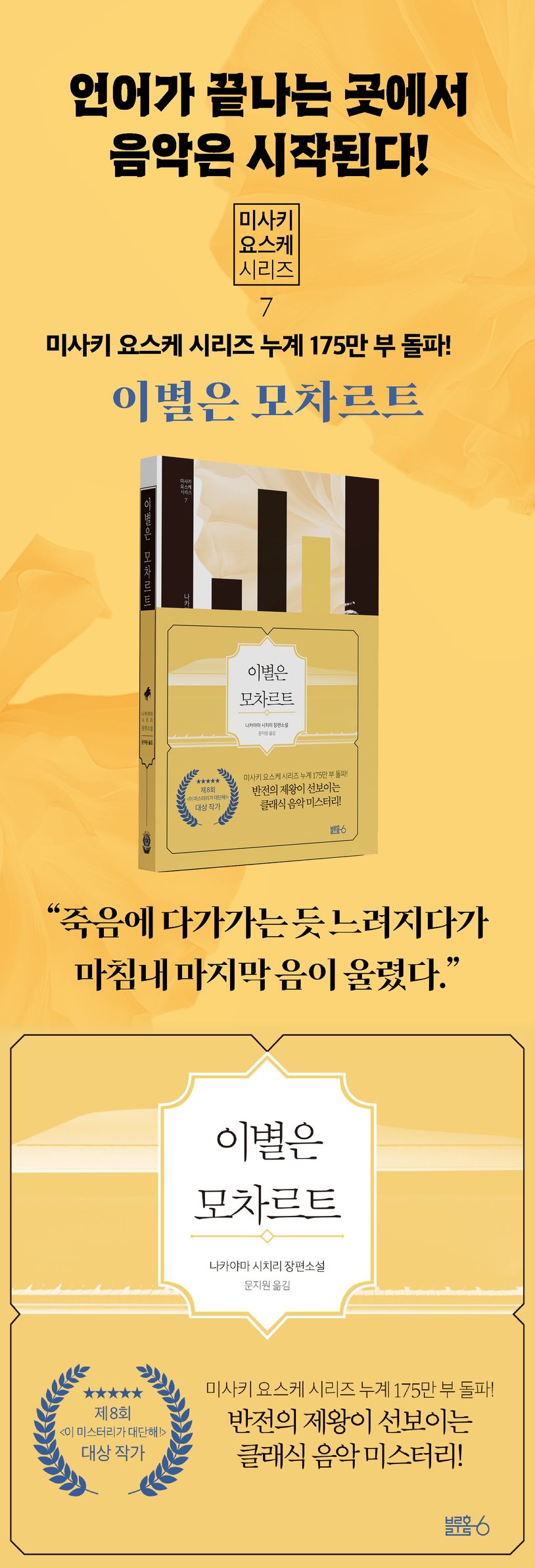 이번에 선보일 작품은 나카야마 시치리의 초절정 인기 클래식 미스터리인 ‘미사키 요스케 시리즈’의 일곱 번째 이야기로 삼 년만에 찾아온 『이별은 모차르트』이다. 『이별은 모차르트』는 ‘음악의 신’인 모차르트 음악을 배경으로 소설을 읽는 내내 클래식 연주를 듣는 듯한 귀한 경험과 함께 짜릿한 미스터리 소설로의 재미도 결코 놓치지 않는다. 작품 속에 나카야마 시치리의 다른 시리즈 주인공들도 깜짝 등장하여 또다시 시치리 월드가 펼쳐지니 독자 여러분께서도 맘껏 즐겨주시기를 바란다.