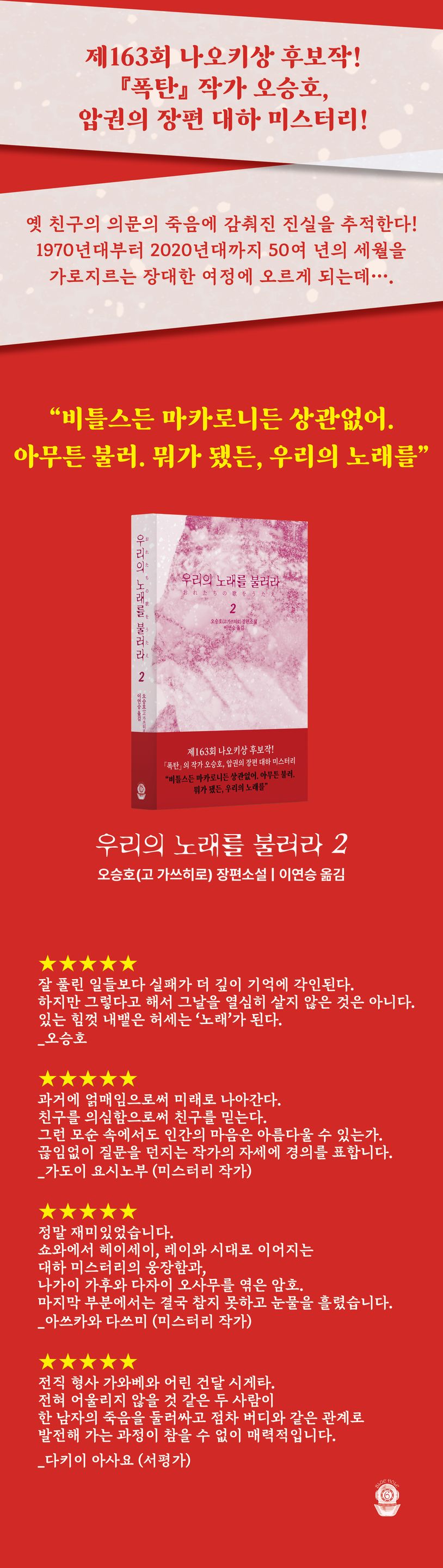 『우리의 노래를 불러라』에서도 마찬가지로 그 면모가 돋보인다. 주인공 가와베는 옛 친구 사토시의 의문의 죽음에 감춰진 진실을 추적하며 1970년대부터 2020년대까지 50여 년의 세월을 가로지르는 장대한 여정에 오르게 된다. 그 긴 시간을 채우는 키워드들은 개발에서 소외된 시골 마을, 재일 한국인 차별, 학생 운동의 흥행과 실패, 버블 붕괴 등 일본 근현대사를 구성하는 큼직한 사건들이다. 이러한 사건들과 등장인물들이 한데 얽히며 작품은 전개된다. 일본 근대 작가들의 문학을 통한 암호 해독, 여러 갈등과 추격전, 예상을 벗어나는 전개는 긴 서사 속으로 독자들을 빠져들게 한다.