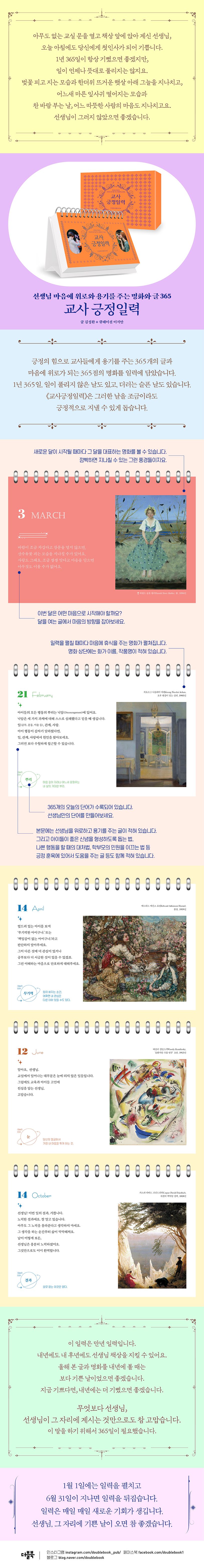 《교사긍정일력》은 긍정의 힘으로 교사들에게 용기를 주는 365개의 글과 마음에 위로가 되는 365점의 명화로 구성되어 있다. 세상에 내 편이 아무도 없을 것 같은 날에도 오롯이 교사의 편이 되어주는 글과 명화. 1년 365일을 매일 기쁘게만 보낼 수는 없다. 일이 풀리지 않은 날도 있고, 더러는 슬픈 날도 있다. 이 일력은 그러한 날을 조금이라도 긍정적으로 보낼 수 있게 도움을 준다.