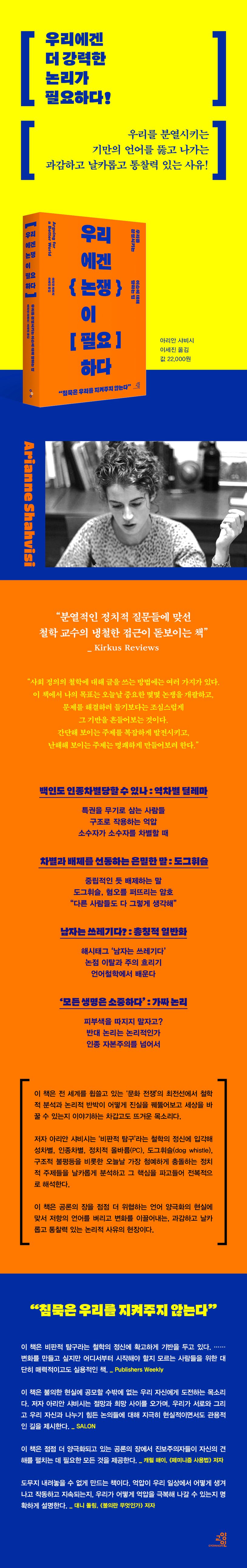 《우리에겐 논쟁이 필요하다》는 우리 일상을 에워싸고 있는 ‘문화 전쟁’에 대한 철학적 해부이자 차별과 혐오에 맞서 목소리를 내고 싶은 이들을 위한 논리적 안내서다. 아리안 샤비시는 철학 교수로서 숱한 토론 수업을 진행하며 학생들에게 받았던 질문들과 사회적·정치적 현안과 관련해 언론 매체에 꾸준히 글을 쓰며 받았던 피드백들을 포함해, 깊이 있는 철학적 지식과 일상에서 건져 올린 풍요로운 사례들을 이 한 권의 책에 모두 녹여 냈다. 샤비시는 역차별 논란, ‘지나친’ 정치적 올바름, 표현의 자유 제한, 기후 위기의 책임 문제 등 오늘날 가장 논쟁적인 이슈들 속으로 들어가, 냉철하게 분석함으로써 논쟁의 장 자체를 뒤흔들고 전복한다. 어떤 문제가 의제화되고 어떤 사실이 은폐되는가. 어떤 개념과 논리가 시선을 끌고 논란을 야기하는가. 샤비시는 논쟁의 배후를 날카롭게 해부함으로써 권력의 언어가 작동하는 방식을 교차성, 총칭적 일반화, 인식적 불의를 비롯한 철학의 도구를 사용해 명료하게 밝혀낸다.