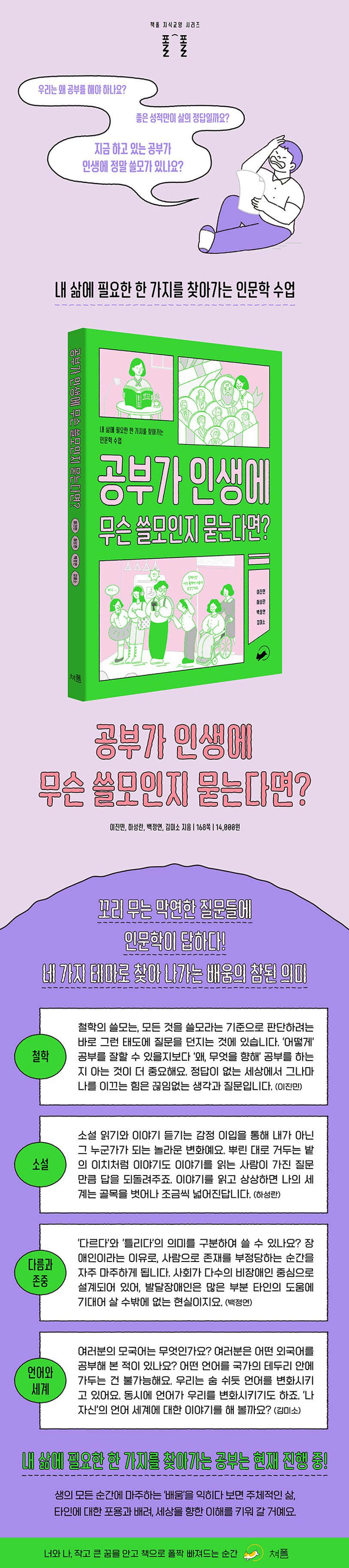 『공부가 인생에 무슨 쓸모인지 묻는다면?』은 철학, 문학, 다름과 존중(장애), 언어의 인문학 테마를 통해 ‘살아가면서 꼭 공부해야 할 한 가지’를 이야기한다. 정치철학자 이진민, 소설가 하성란, 사회적기업가이자 사회복지사 백정연, 언어학자 김미소 네 명의 저자가 각자의 이야기를 전하며 살아가는 데 필요한 나만의 배움을 진솔하고 흥미롭게 털어놓는다. 또한 재치 있고 유머러스한 스타일로 독자들의 사랑을 받는 일러스트레이터이자 베스트셀러 작가이기도 한 이주윤의 그림이 본문에 더해져 읽기의 즐거움을 풍성히 돕는다.