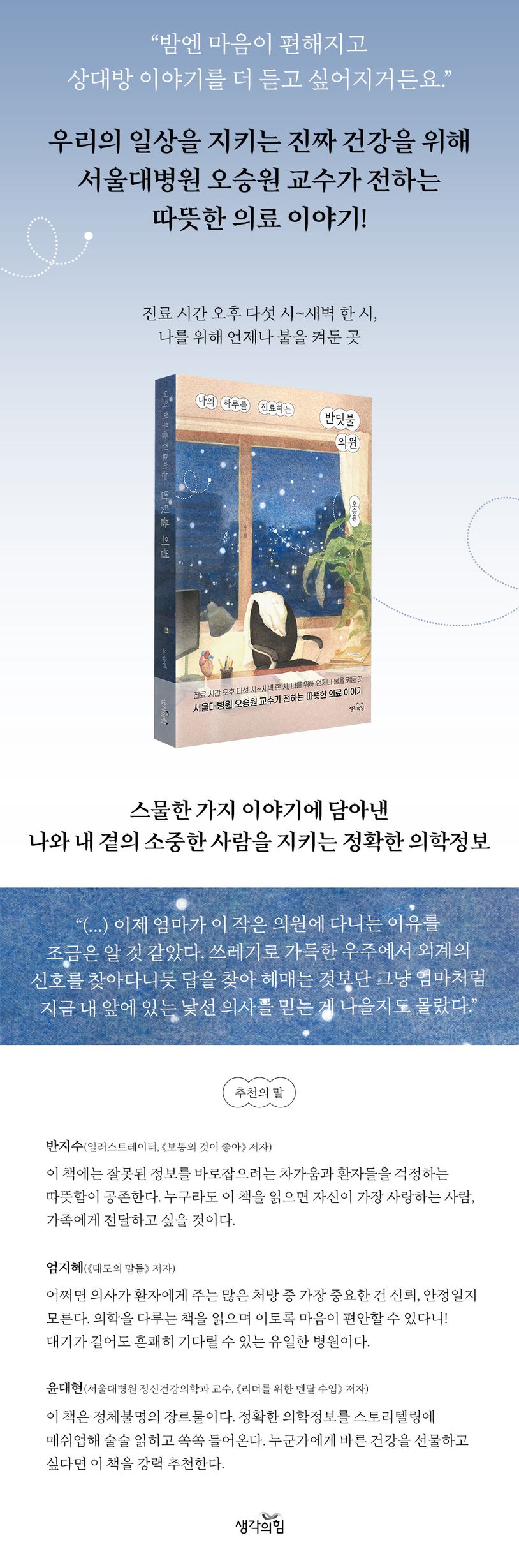 저자 오승원 교수는 자극적이고 잘못된 정보가 아닌 올바른 의학정보를 쉽고 재미있게 전달하고자 하는 마음을 담아 ‘반딧불 의원’이라는 치유의 공간을 만들어냈다. 환자들의 고유한 삶의 형태와 크고 작은 증상들에 면밀하게 주의를 기울이는 의사의 손에서 탄생한 이 책은 평범한 우리들의 삶과 병을 이야기한다. 내 주변 어딘가 있을 법한 인물들이 다양한 아픔과 병을 상담받고 치유받는 과정을 통해 독자는 올바른 정보를 얻게 됨은 물론, 따뜻하고 편안한 위로를 받을 수 있다. “반딧불 의원이 진짜 있으면 좋겠다”는 어느 독자의 말처럼, 이 책은 삶에 지치고 피로한 이들에게 적절한 처방이 될 수 있다. 우리의 삶을 지탱하는 것은 환상이 아닌 건강이다. 이 책은 독자의 일상에 바른 건강을 선물한다.