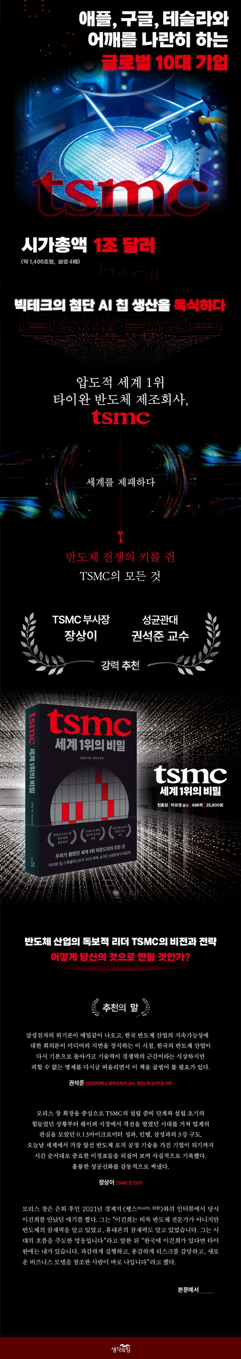 2024년 3월 《TSMC 세계를 움직이는 비밀TSMC 世界を動かすヒミツ》이라는 제목으로 출간되어 큰 화제를 모으기도 했으며 TSMC의 성공전략, 특히 제조업에서 드문 서비스 정신과 상상을 초월하는 R&D 열정을 상세히 담아냈다. 초기 설립 과정에서부터 창업자 모리스 창이 엔지니어 영입에 공을 들인 TSMC는 엔지니어 위주의 조직 구성을 일구었다. 이를 바탕으로 R&D에 집중해 고객사의 주문을 수율 높게 처리하며 국제적 신뢰를 쌓았다. 미세 공정에서의 탁월한 노하우를 바탕으로 미·중 반도체 전쟁 속에서도 입지를 굳건히 다지고 있다. 일본과의 동맹, 미국 공장 설립으로 미국의 대對중국 수출 제재로 인한 피해를 최소화하고 있으며 빅테크의 비전을 제조로 현실화하는 기업으로서 그 존재 의의가 빛난다. 저자 린훙원은 기자가 된 첫해에 모리스 창을 인터뷰하며 30년간 테크 산업을 취재해 온 명실공히 TSMC 전문가다. 삼성전자의 위기론이 불거진 지금, 글로벌 10대 기업, 시가총액 1,400조, 파운드리 시장 점유율 60퍼센트의 압도적 세계 1위 기업이자 한국 반도체 산업이 기를 쓰고 좇아야 할 TSMC의 모든 것이 이 책에 담겼다.
