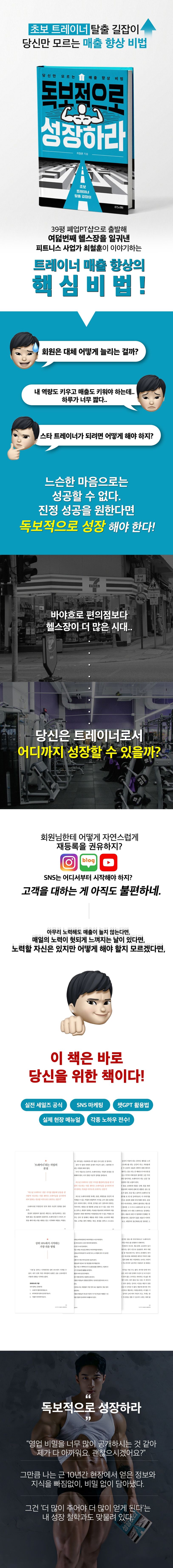 『독보적으로 성장하라』는 매출 향상을 원하는 트레이너들을 위한 실용서다. 저자 최철훈은 스물다섯 살에 대학교를 휴학하고 폐업한 PT 샵을 인수하는 데에서 시작해, 불과 십 년도 안 되는 짧은 시간 동안 직영점 여섯 곳의 ‘미녀와야수짐’ 헬스장을 일궈 낸 독보적인 사업가다.