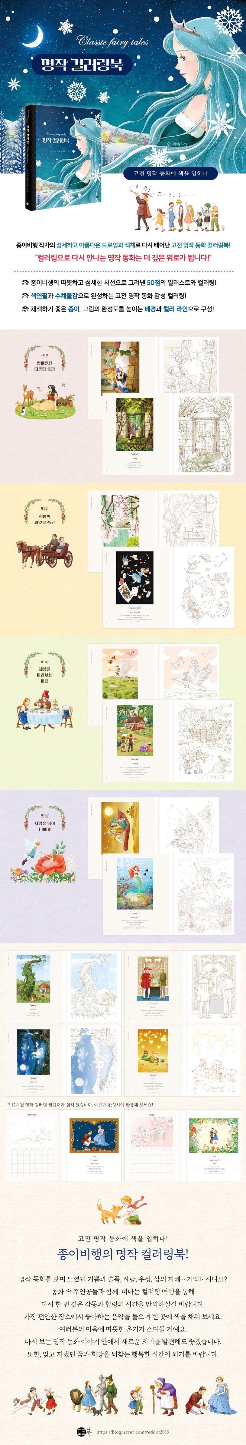 이 책은 누구나 읽고 좋아했던 명작 동화들을 주제에 따라 4개의 장으로 나누어 구성했습니다. 빨간 머리 앤, 플랜더스의 개, 행복한 왕자의 ‘따뜻했던 순간들’, 앨리스, 피터 팬, 엄지공주, 피노키오가 품었던 ‘희망의 씨앗들’, 알라딘과 걸리버, 헨젤과 그레텔이 떠나는 ‘세상으로의 모험’, 신데렐라, 로미오와 줄리엣, 미녀와 야수, 어린 왕자 등이 ‘마음속에 품었던 사랑’ 등을 주제로 동화 속 명장면을 50컷의 일러스트와 컬러링 페이지로 재탄생시켰습니다. 책의 마지막에는 직접 만들 수 있는 12개월 명작 컬러링 캘린더를 실었습니다.