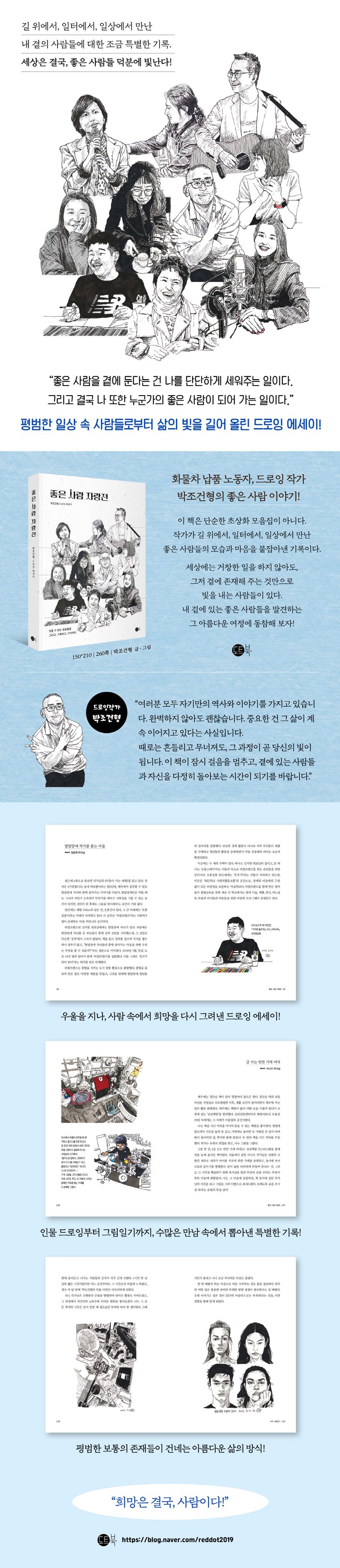 책 속에는 가족과 친구, 직장 동료, 모임에서 만난 사람들, 그리고 우연처럼 스쳐 간 인연들이 등장한다. 평범한 일상에서 드러나는 각자의 내력과 이야기를 따라가다 보면, 우리는 그 속에서 자신이 받은 위로와 희망을 새삼 확인하게 된다. 그리고 어느 순간 깨닫게 된다. 내 곁에도 이미 ‘좋은 사람들’이 있음을. 힘든 날 내 편이 되어 준 친구, 지친 하루를 웃게 해준 동료, 묵묵히 곁을 지켜 준 가족. 이 책은 그 소중한 순간들을 다시 떠올리고 자신 곁의 관계를 다시 바라보게 만든다. 이제는 우리 차례다. 곁에 있는 사람에게 고맙다고 말하고, 사랑한다고 표현해 보자. 좋은 사람을 만난다는 건 내 안을 다시 세우는 일이고, 누군가의 좋은 사람이 되어 주는 일이기도 하다.