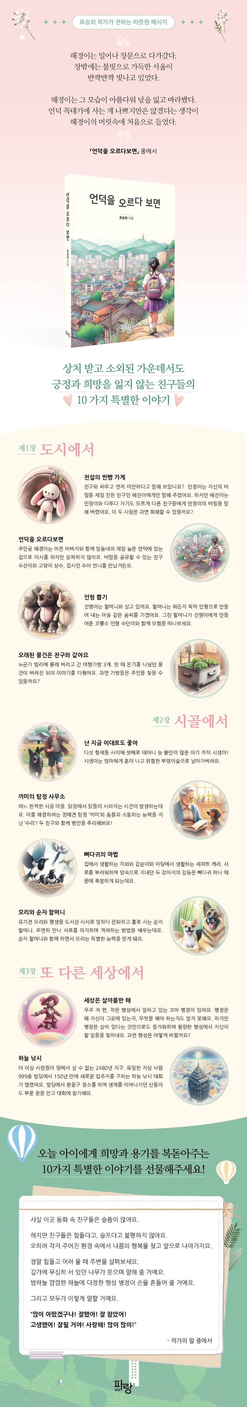『언덕을 오르다 보면』은 도시, 시골, 또 다른 세상이라는 세 가지 무대에서 펼쳐지는 10가지 이야기를 담은 동화집이다. 각각 이야기에 등장하는 주인공들은 하나 같이 소외와 결핍이 공존하는 이들이다. 아버지의 암투병으로 달동네로 이사를 오게 된 해경이, 마트에서 과일을 파는 엄마가 부끄러운 민정이, 다리가 하나 없이 태어난 장애견 깜이, 먼 미래 어느 마천루에서 환풍구를 청소하는 고아 산돌이.