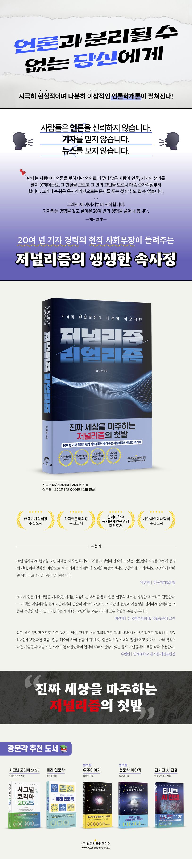 또‘사상초유’의일들이끊임없이이어진2024년과2025년대한민국에서살아가다보면다시언론을떠올리지않을수없습니다.비정상이이어질때는무엇이어떻게진행되고있는지정확히아는것이중요하기때문입니다.그리고무엇이옳고무엇이그른지가려내기위해서는합리적판단기준이필요하고,객관적이고중립적으로정보를제공할수있는것도언론일수밖에없기때문입니다.당신이이책을손에쥔이유도언론에대한버릴수없는,미련같은애정이있는까닭일겁니다.