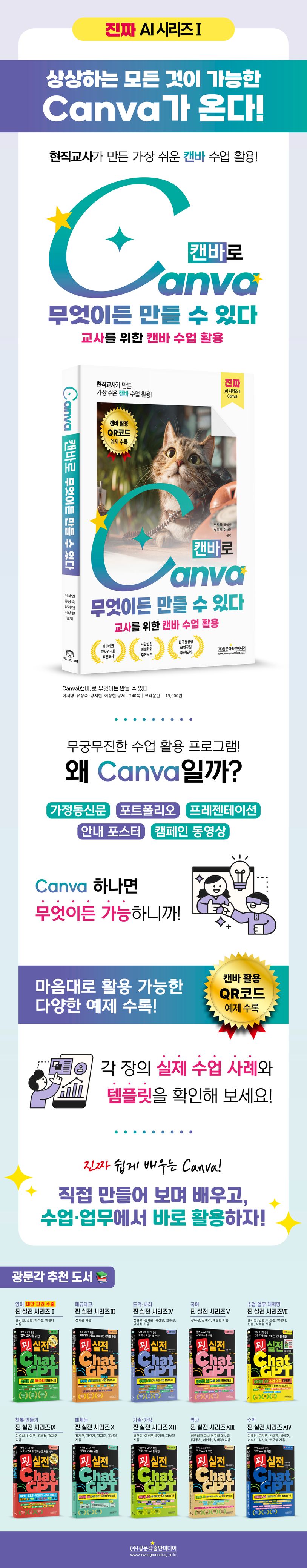 또한,에듀테크의특성상Canva의인터페이스와버튼구조는매우자주업데이트됩니다.책이출간된후얼마지나지않아버튼의명칭이나위치가달라질수있으므로,화면구성이다를경우에는Canva공식매뉴얼을참고하시기바랍니다.이러한변화를돕기위해저자들은직무연수,유튜브라이브방송등을통해책의예시와기능변화를지속적으로안내할예정입니다.관련QR코드는책뒤표지에함께수록되어있으니,최신정보와실습자료를확인하시기바랍니다.