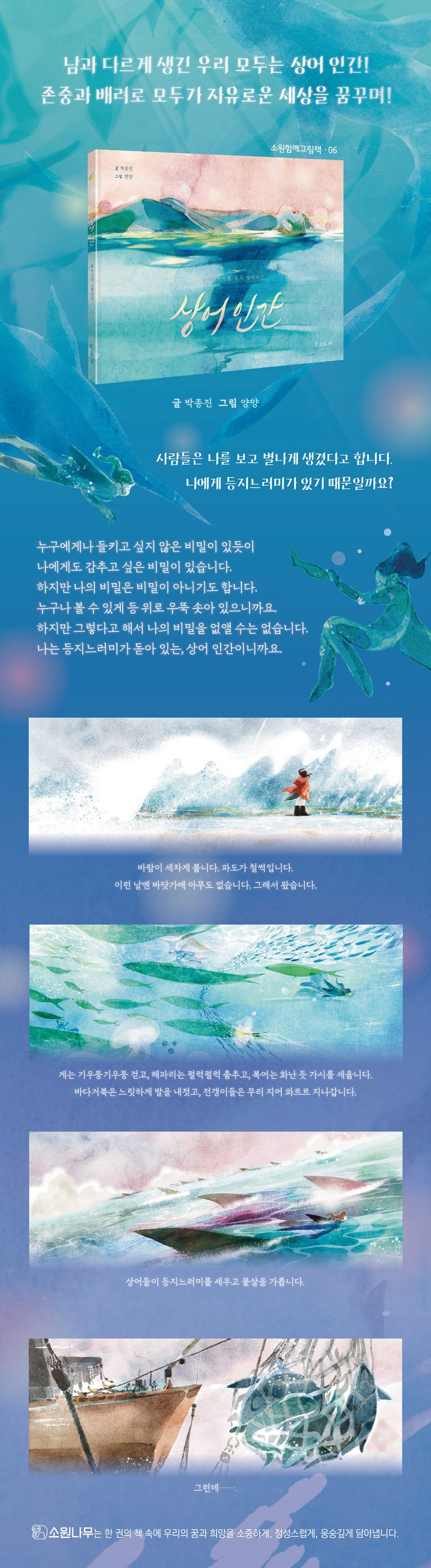 아이부터 어른까지 모두 볼 수 있는 소원함께그림책 06권. 『상어 인간』은 남에게 숨기고 싶은 비밀을 가진 ‘상어 아이’의 이야기를 담담하면서도 가슴 뭉클하게 전하고 있습니다. 별나게 생겼다는 이유로 사람들에게 소외를 당한 ‘상어 아이’가 자신의 존재를 오롯이 인정받는 바닷속에서 이전에는 느낄 수 없었던 자유를 만끽하고 다시 살아갈 힘을 얻는다는 내용을 담고 있습니다. 『상어 인간』은 마음을 보듬는 글과 아름다운 바닷속이 담긴 그림으로 타인의 시선에 상처받았던 모든 이들에게 용기와 희망을 선물합니다.