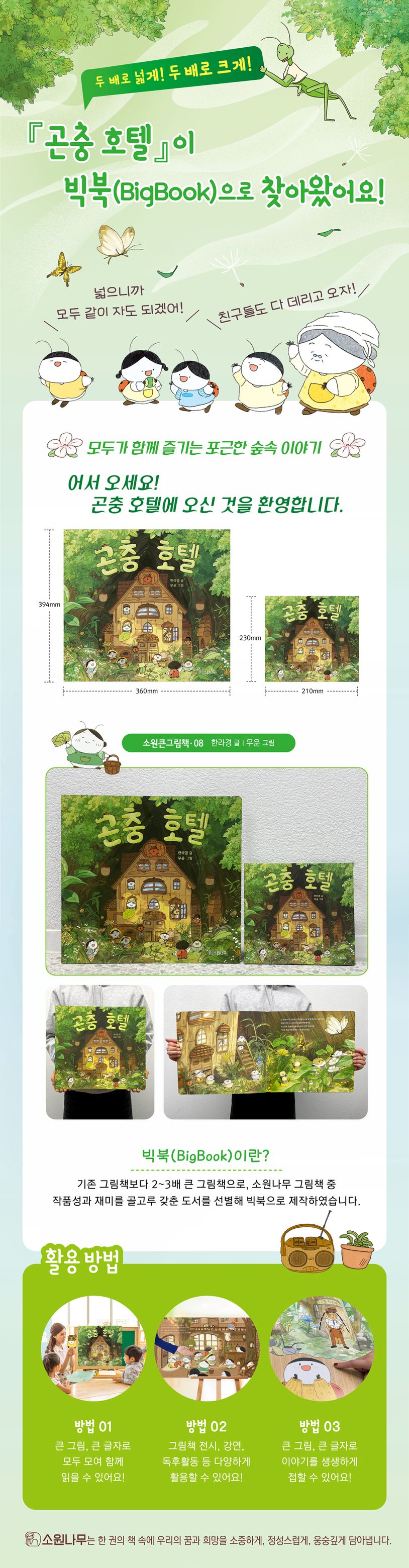 『곤충 호텔』을 ‘소원큰그림책’으로 만나 보세요. ‘소원큰그림책’은 기존 그림책보다 2~3배 큰 그림책으로, 소원나무에서 출간한 그림책 중 작품성과 재미를 두루 갖춘 도서를 선별하여 만들었습니다. 『곤충 호텔』 빅북은 가로 380mm, 세로 347mm 크기로, 독자들이 곤충들의 아기자기하고 따뜻한 공간을 자세히 살펴보며 더욱 풍부한 책 이야기를 나눌 수 있습니다. 『곤충 호텔』 빅북을 통해 그림책 전시, 책 읽기 수업, 그림책 강연 등 다양한 독서 활동을 즐겨 보세요.