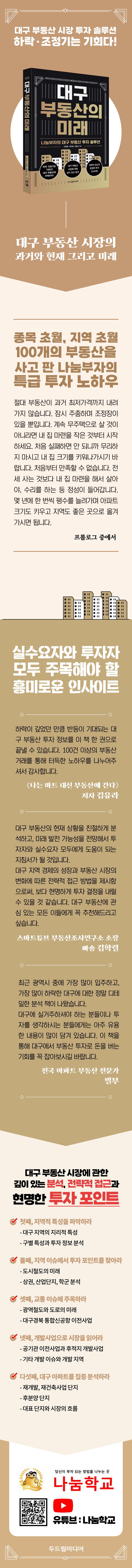 이 책은 이러한 대구 부동산 시장에 주목한다. 오로지 대구 부동산 시장에만 집중해서 한 권의 내용을 채웠다. 10년 전부터 투자자로 시작해서 전국적으로 100여 개의 부동산을 매입하고 매도한 대구 출신 저자가 다시 대구로 돌아와 대구 부동산 시장을 분석해서 자신만의 인사이트를 담아 내용을 채웠다. 역시 대구 부동산 전문가들인 공저자들도 집필에 가세했다. 아직도 높은 취득세, 고금리 문제, 원자재가격 상승 등 부동산 투자의 걸림돌이 존재하지만, 부동산이 절대 과거 최저가격까지 내려가지 않으리라는 것은 분명하다. 특히 탄탄한 배후수요에 주목해서 하락·조정기의 시장을 기회로 만들자. 이 책은 대구 부동산 시장에서 기회를 찾는 부동산 실수요자, 투자자들에게 현명한 인사이트를 제공할 것이다.