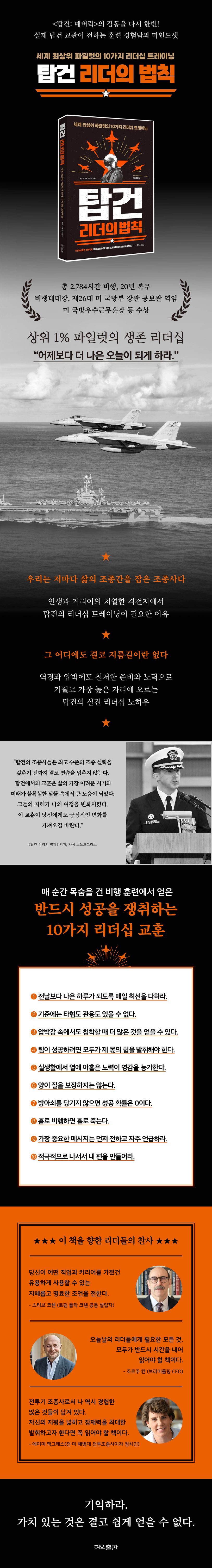 《탑건 리더의 법칙》은 F/A-18 전투기 조종사이자 탑건 교관 출신인 저자가 20년간 세계 각지의 하늘에서 복무하며 얻은 10가지 리더십 교훈을 담은 책이다. 매 순간 목숨을 건 아찔한 비행 훈련에서 배운 그 교훈들은 저자가 현역에서 물러난 후 국방부 장관 공보관, 국가 안보 자문 기관의 CEO로 새로운 항로를 개척할 때도 큰 도움이 되었다. 우리 사회 역시 생존과 승리를 건 치열한 전투가 벌어지는 전장과 같다. 그것이 탑건 리더십이 인생과 커리어의 격전지에서 여전히 유효한 이유이다. 지금껏 그 어떤 책에서도 소개된 적 없었던 탑건의 훈련법과 10가지 리더십 법칙은 독자들이 주체적인 삶을 향해 날아오를 수 있도록 강력한 동기부여를 할 것이다.