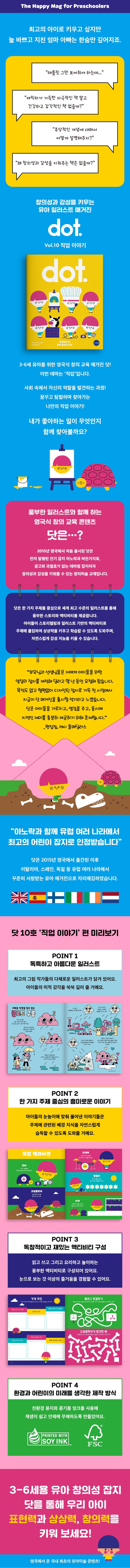 3-6세 독자들을 위한 창의미술 교재로 유명한 영국의 인기 일러스트 매거진 닷! 특유의 고급스러움을 더욱 강화한 한국어판이 공식 출간되었어요. 일상에서 접하는 흥미로운 주제 한 가지를 선정해 읽기와 쓰기, 색칠하기, 그리기, 요리하기 등 주제와 관련한 다채로운 콘텐츠들을 담았어요. 먼저 출간된 5-9세 어린이 매거진 아노락과 마찬가지로, 해외의 여러 아티스트가 작업한 감각적인 일러스트를 가득 싣고 있답니다. 곳곳의 재미난 이야기와 액티비티는 아이들이 더욱 능동적으로 창의적인 활동에 참여할 수 있도록 돕는 역할을 해요. 21세기 창의력의 시대, TV나 스마트폰은 잠시 옆으로 치워두고 닷과 함께 읽고, 그리고, 쓰면서 아이들의 상상력과 창의력을 쑥쑥 길러 보세요!