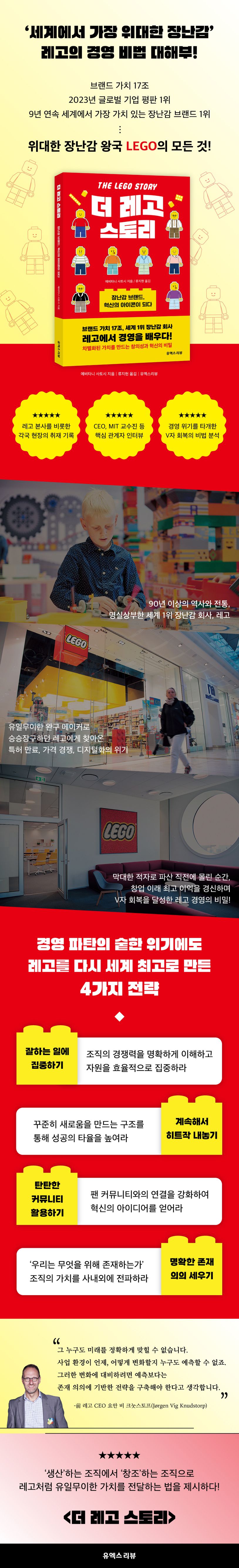 《더 레고 스토리》는 〈닛케이 비즈니스〉 저널리스트 출신의 저자가 덴마크의 레고 본사를 비롯해 세계 각지의 현장을 다니며 경영진부터 과거 직원들까지 수많은 관계자를 취재한 끝에 펴낸 ‘위대한 장난감 왕국 보고서’이다. 여태까지 알려진 것 그 이상의 방대한 정보가 수록되어 있다. 브랜딩, 비즈니스 모델, 콘텐츠 전략, 조직 문화, 제조 현장까지 레고의 구석구석을 면밀하게 살펴 레고가 최고의 자리에 오르고 이를 유지할 수 있었던 비결을 담았다. 또한, 지금까지 잘 알려지지 않았던 레고 내부의 위기와 환희의 순간들을 조명하여 그 파란만장한 궤적을 고스란히 그려낸다. 이 책은 지금의 레고가 파는 것이 단순한 블록이 아닌 그들만의 독보적인 가치라고 말한다. 치열한 가격과 기술 경쟁에서 당당히 승리를 거둔 레고의 생존 법칙은 조직의 리더에게는 뛰어난 경영 전술의 본보기가, 경쟁 사회에서 살아가는 개개인에게는 독창적인 장점을 갈고닦을 수 있는 힌트가 되어 줄 것이다. 레고의 과거, 현재, 미래를 한눈에 볼 수 있어 레고를 사랑하는 팬들에게 소장 가치도 있다.