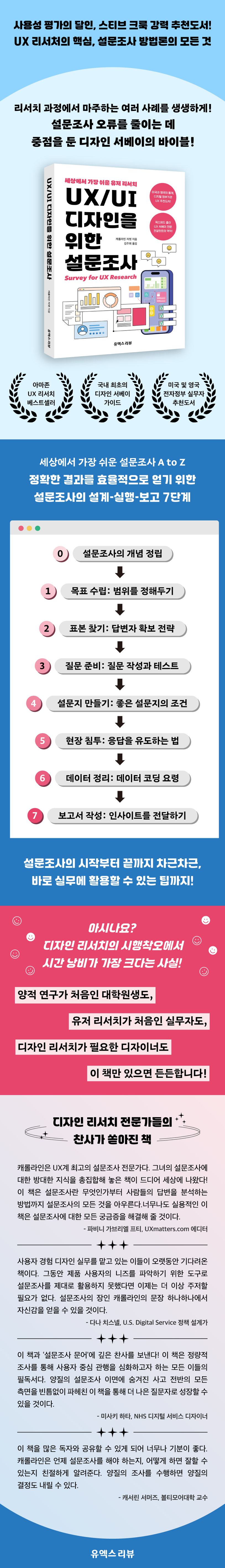 이 책은 통계적 지식이 필요하고 많은 시행착오를 유발하여 늘 어렵게 여겨졌지만 사용자의 니즈를 파악하기 위한 도구로 가장 널리 활용되는 설문조사가 어려웠던 디자이너, 리서처, 그리고 대학원생들에게 특히 도움이 될 것이다. 설문조사의 기초 개념 정리부터 사람들의 답변을 적절히 구하고 분석하는 방법까지 모든 것을 다루면서도 UX 디자인과 디자인 리서치 실무에 관한 사례를 광범위하게 제시함으로써 디자인에 최적화된 참고서라고 자부한다. 특히 더욱 쉽고 명쾌한 학습을 위해 일명 ‘설문조사 문어’를 보여준다. 설문조사의 전 과정에서 내리는 선택을 추적하기 위해 설문조사 문어의 촉수를 인용해 설명하는데, 마치 캐릭터가 움직이며 단계 단계를 안내하듯 설문조사 방법, 오차 등 책의 각 부분을 자연스레 연결해 주어 유기적인 이해를 돕는다.