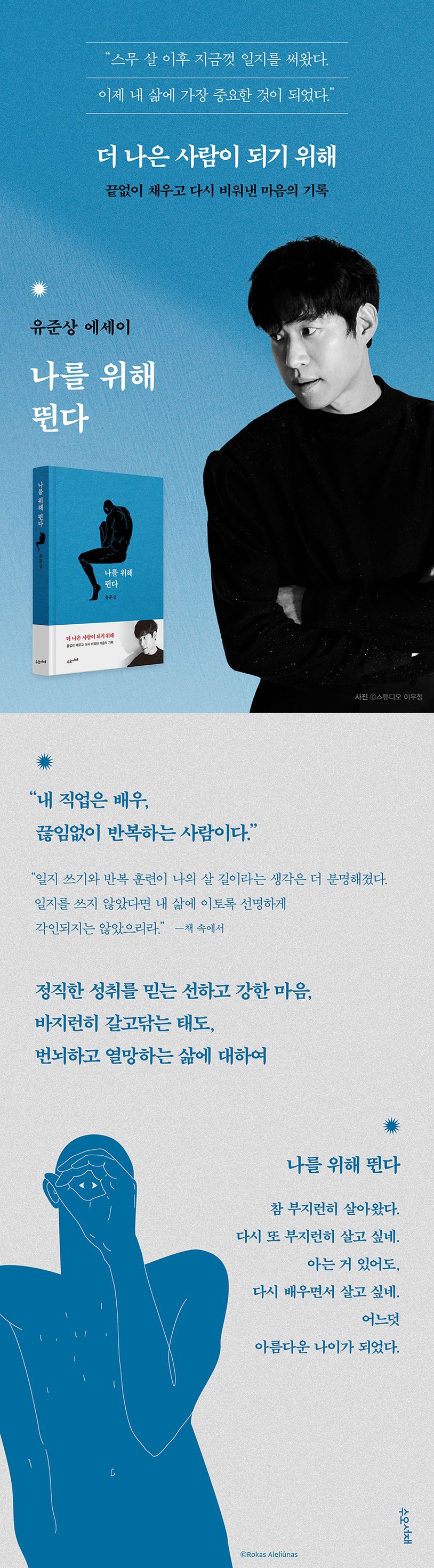 1995년 데뷔 이래 영화와 드라마, 뮤지컬을 넘나들며 약 100편의 작품에 출연한 배우는 2023년 한 해 동안 드라마 두 편, 영화 한 편, 뮤지컬 한 편, 앨범 한 장을 필모에 올렸다. 이러한 그를 항상 따라다니는 수식어가 있다. ‘열정적인 배우’, ‘도전하는 사람.’ 이 책에는 그와 같은 수식어가 무엇을 바탕으로 피어난 것인지, 한없이 견고해 보이는 그의 노력과 성취의 이면에 무엇이 있는지 드러내 보여준다. “삶과 연기는 같이 간다”라고 말하는 사람 유준상이 써내려간 진솔한 문장 속에 정직한 성취를 믿는 선하고 강한 마음, 바지런히 갈고닦는 삶의 태도가 있다. 오늘날 자신의 일과 삶에 충실하고자 애를 쓰는 모든 사람에게 잘하고 있다고, 다시 ‘나를 위해 뛰자’고 격려와 용기의 메시지를 전한다.